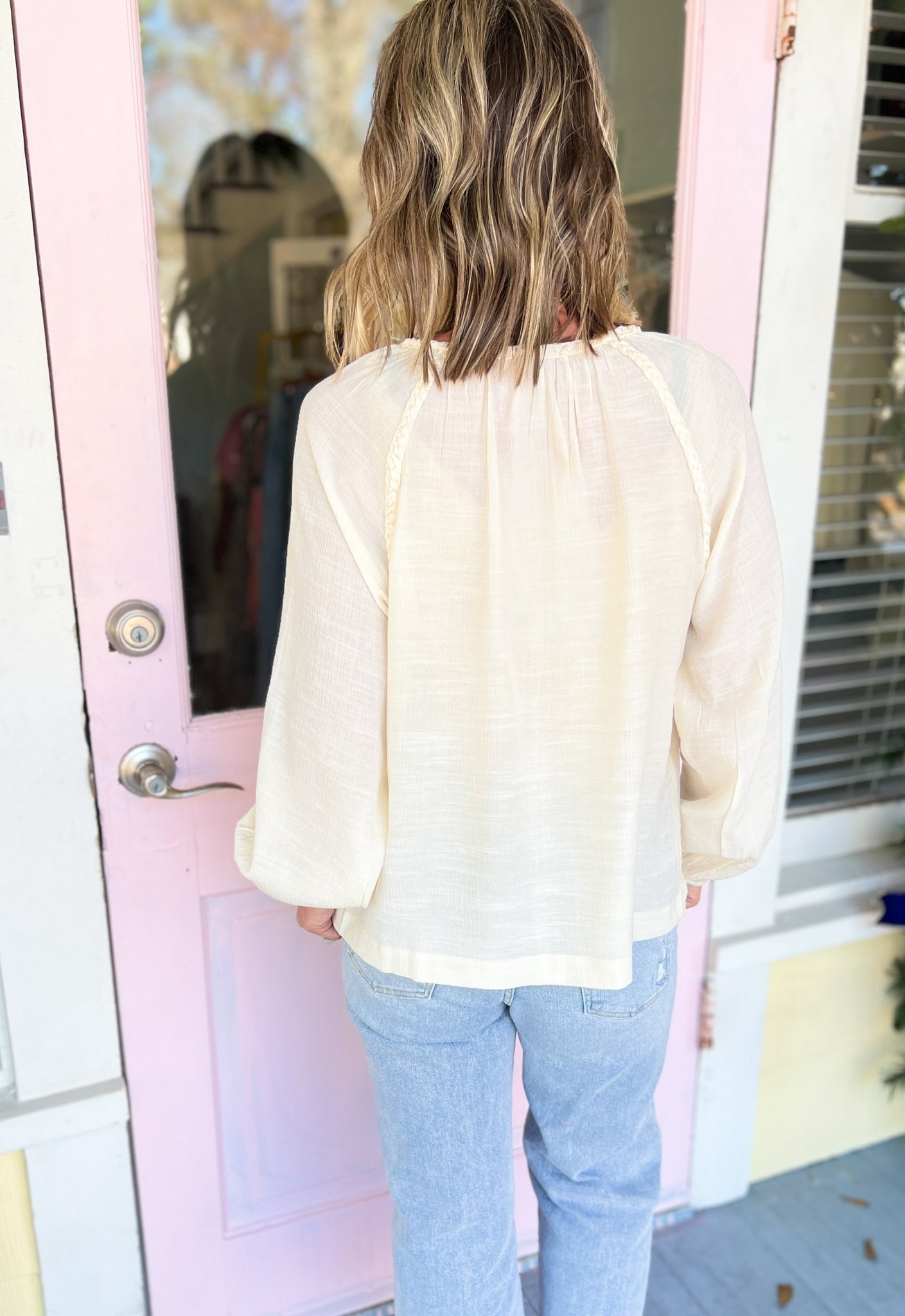 Crafted from a lightweight cotton-blend fabric, this peasant top delivers exceptional breathability and natural movement. The split V-neckline creates an effortlessly flattering silhouette, while billowy long sleeves with gathered cuffs introduce romantic dimension. Intricate braided detailing along the neckline and seams provides artisanal character and visual interest. The relaxed fit ensures all-day comfort without compromising style.