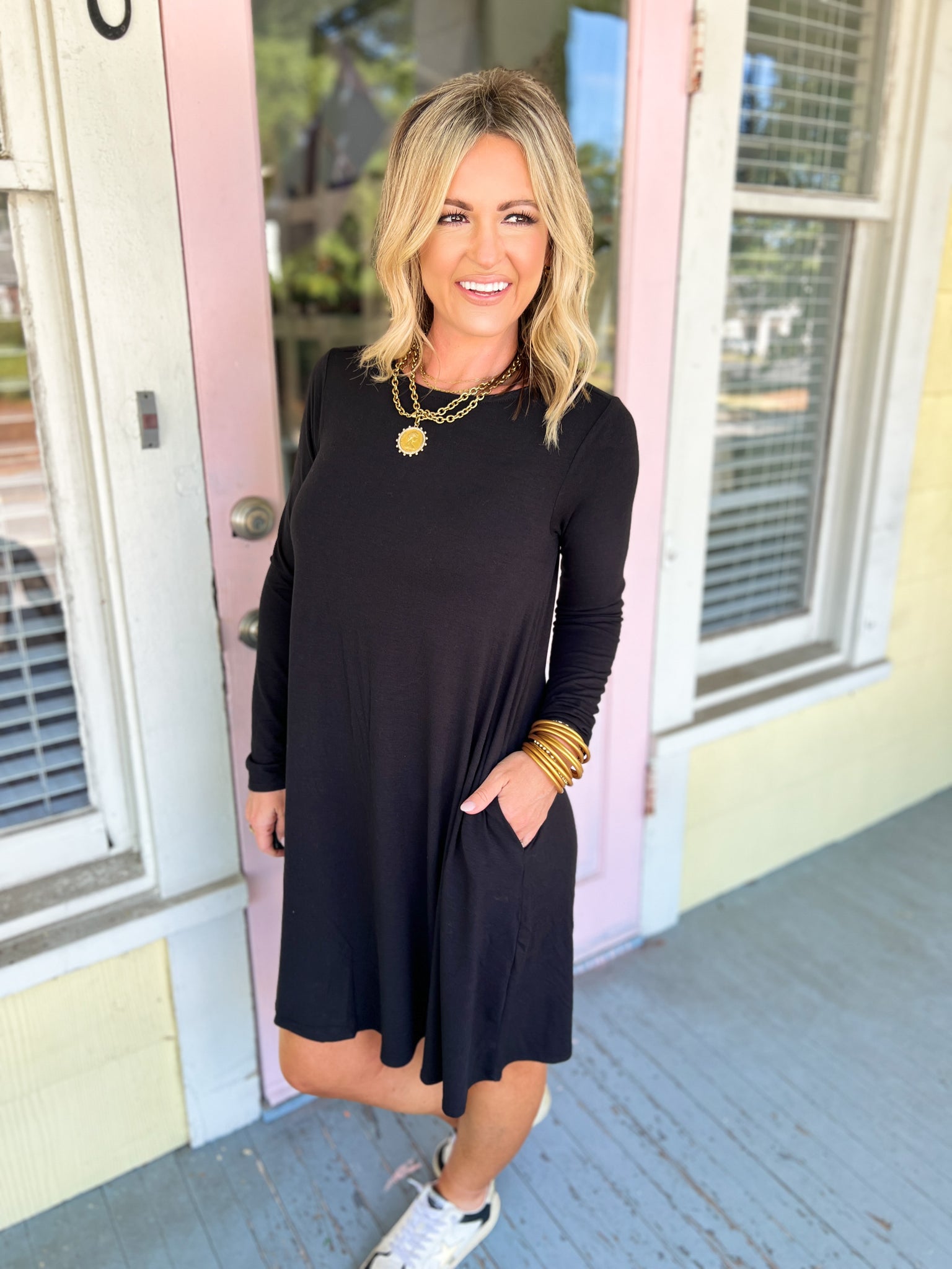 Step out in style with the Free My Heart Flare Dress in black. This playful long-sleeve dress features a flattering flare silhouette that moves with you and convenient side pockets to keep essentials close. Perfect for adding a touch of fun and flair to your everyday wardrobe.