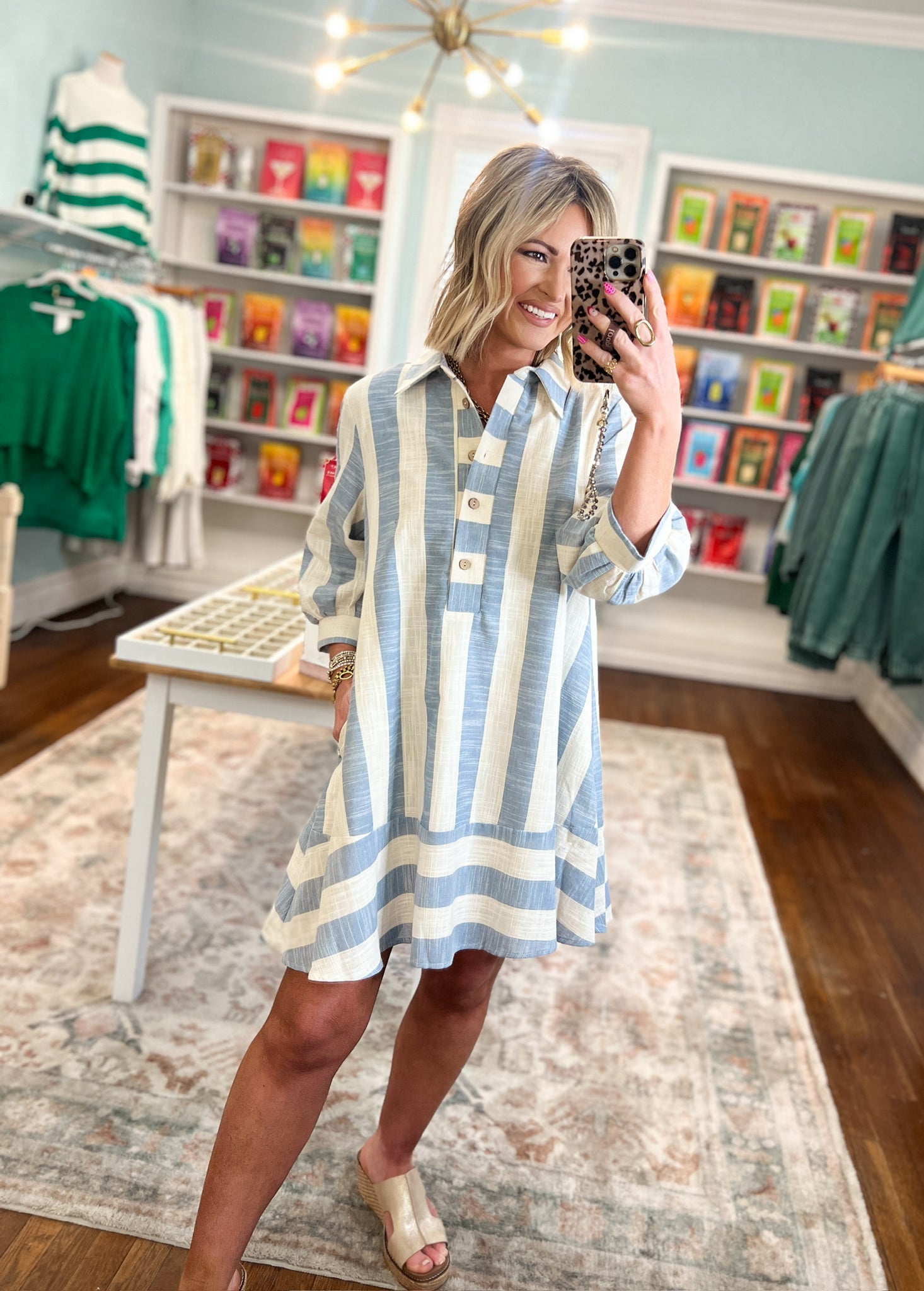 This effortlessly chic striped dress is designed with a relaxed, swingy silhouette that’s both flattering and comfortable. Featuring a classic collared neckline, button-front detail, and three-quarter sleeves, it’s perfect for polished yet laid-back styling. Lightweight and breathable, it’s an easy choice for everything from weekend outings to beachside strolls.