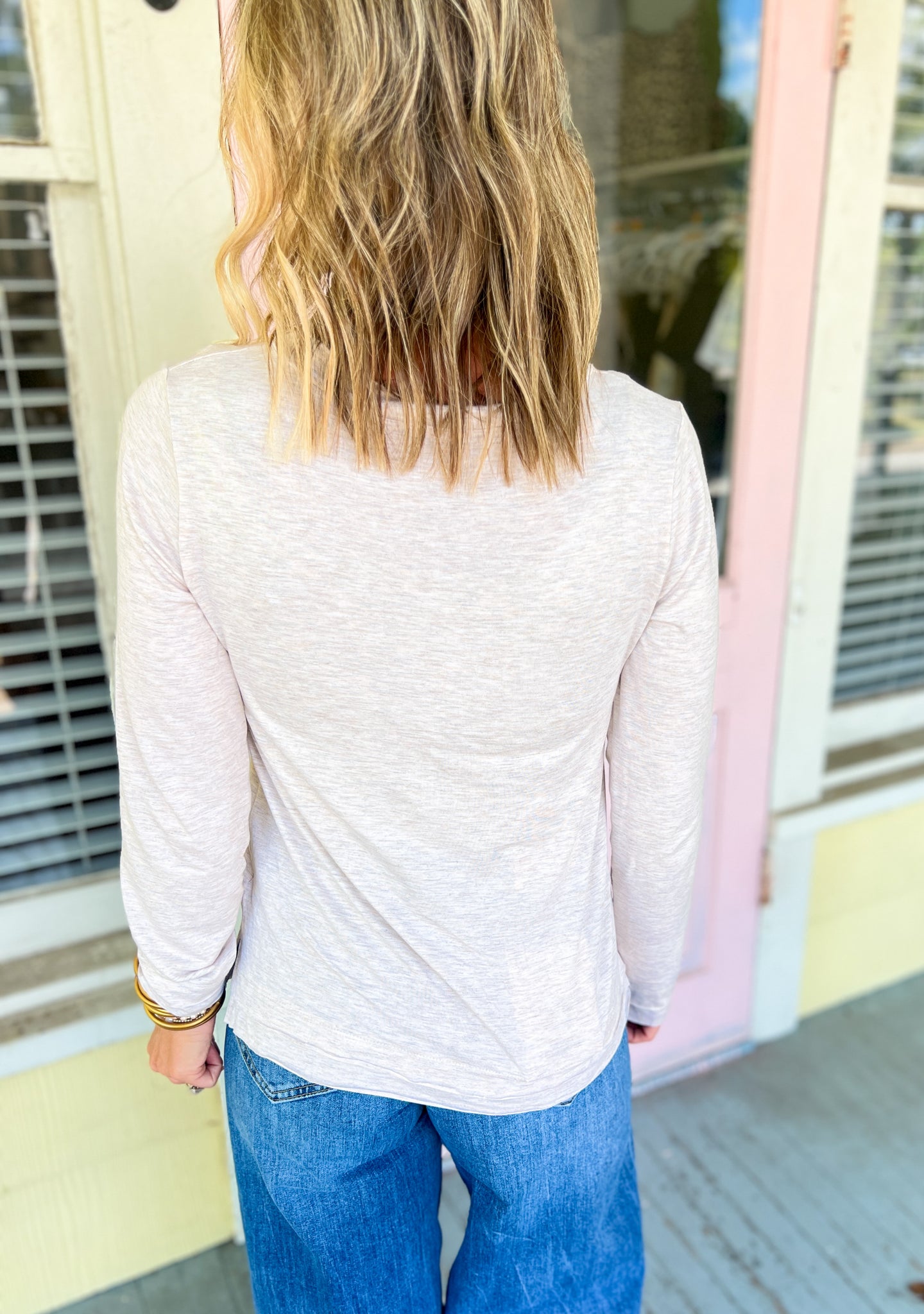 This long sleeve top features a clean and simple design with a soft V-neckline and subtle layered hem detailing. Made from a lightweight, stretchy fabric, it offers all-day comfort and an easy, relaxed fit. Perfect for layering or wearing on its own, it's a versatile staple for casual styling.