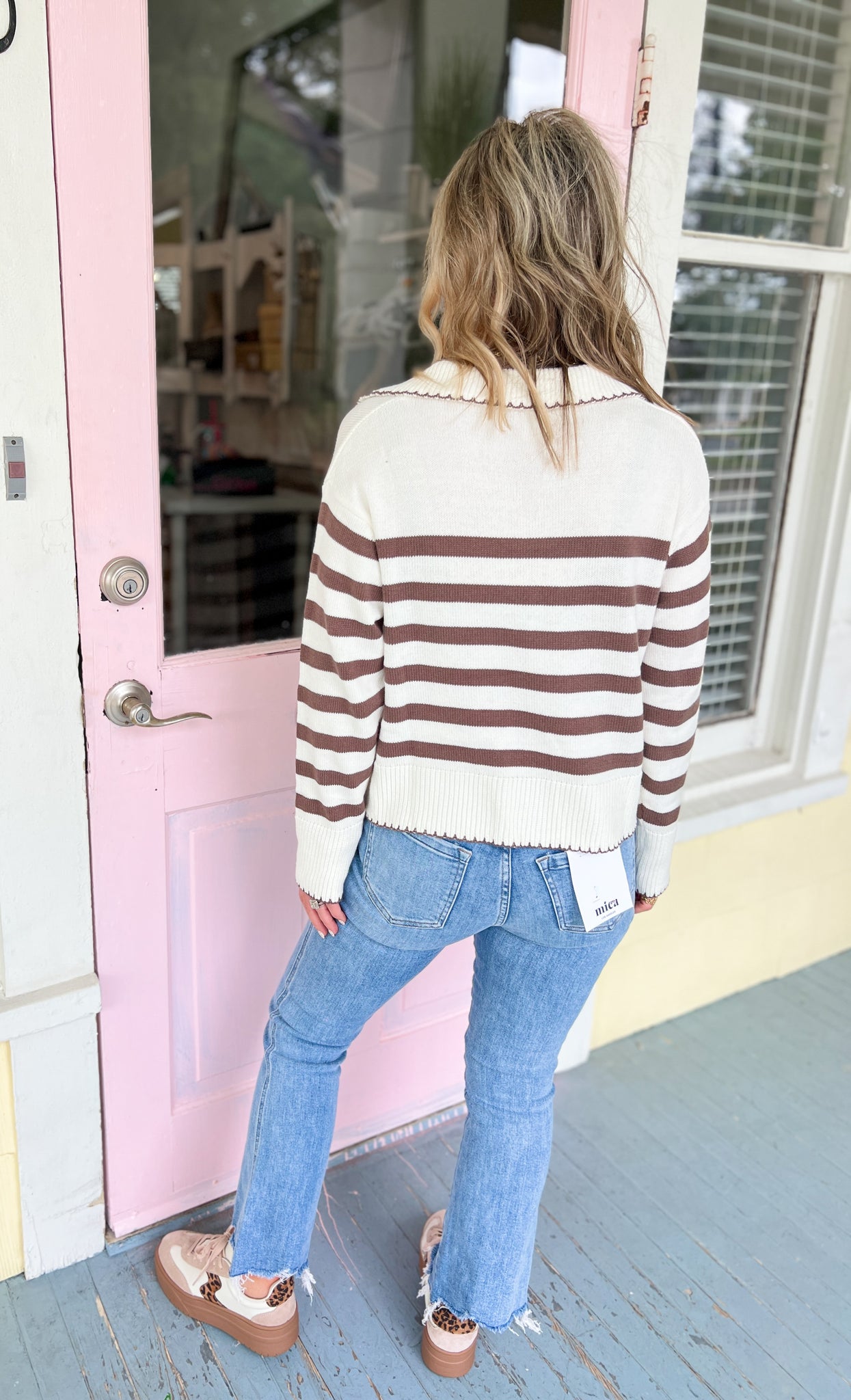 Embrace cozy vibes with this Modern Comfort V-Neck Sweater. Its relaxed fit and drop shoulder design let you lounge or leap into your day with ease. Playful stripes add a pop of fun, while whipstitch details bring a charming handmade touch. Perfect for those who want comfort and style to hang out together.