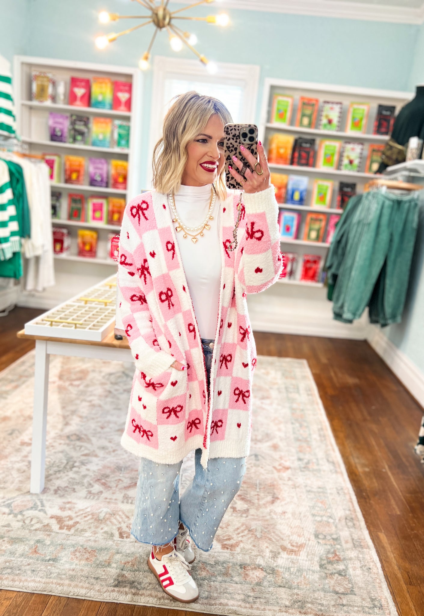 Slip into effortless style with our Be Mine and Wear Bows Cloud Cardigan—a wardrobe essential that's as soft as it sounds. Crafted from premium, cozy fabric, this cardigan features an adorable bow-print design and practical side pockets for your everyday essentials. Perfect for layering over your favorite tee or dress, it's the kind of piece you'll reach for again and again.