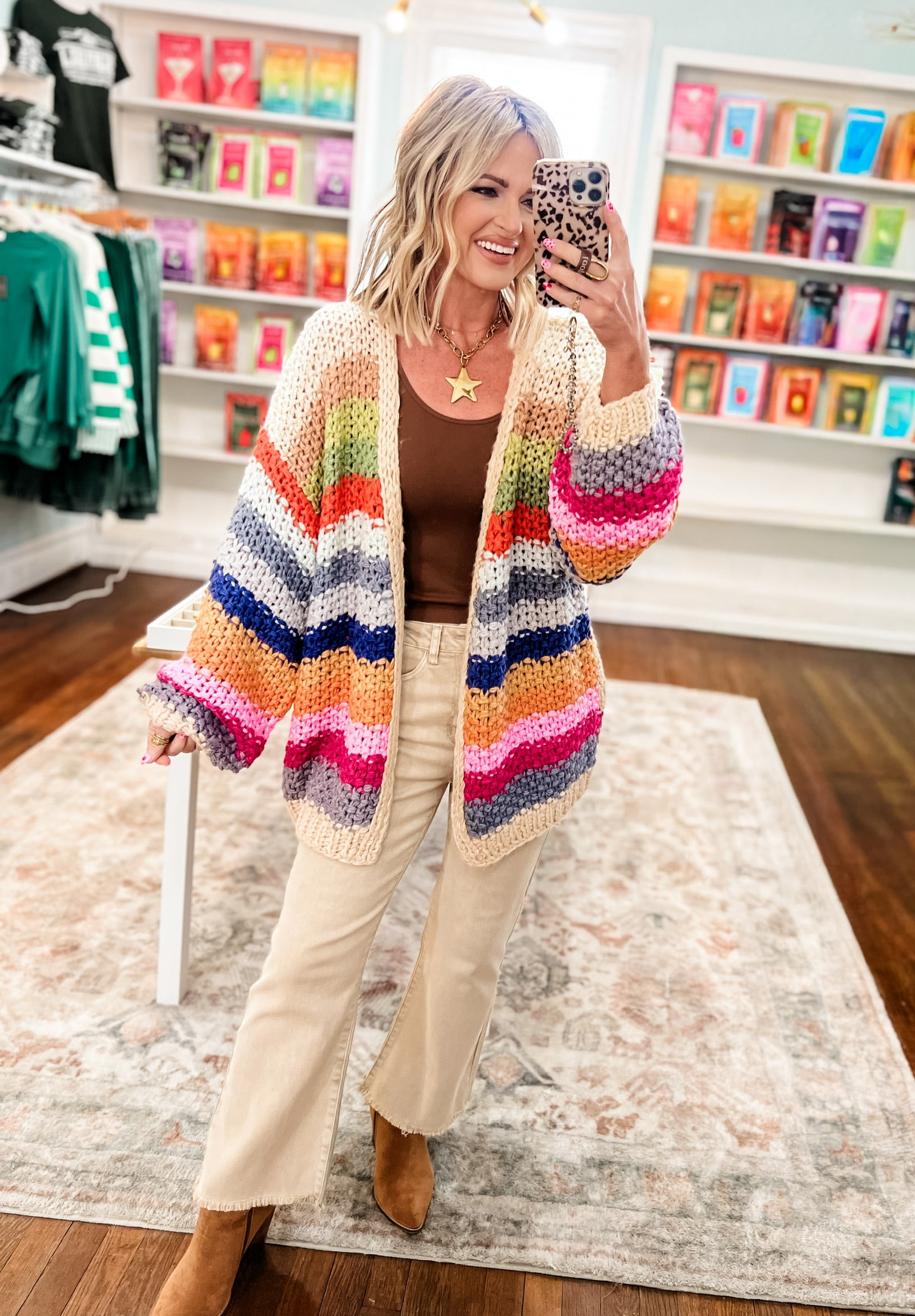 This hand-crocheted cardigan is pure joy wrapped in rainbow stripes! Crafted with thick yarn in bold, cheerful colors, it's the kind of piece that makes getting dressed fun. The relaxed open-front drapes beautifully over anything, while those voluminous balloon sleeves add a whimsical vintage flair. Cozy chunky knit keeps you warm without feeling heavy, and ribbed edges give it just enough structure to look intentional and spacious side pockets hide perfectly in the design.