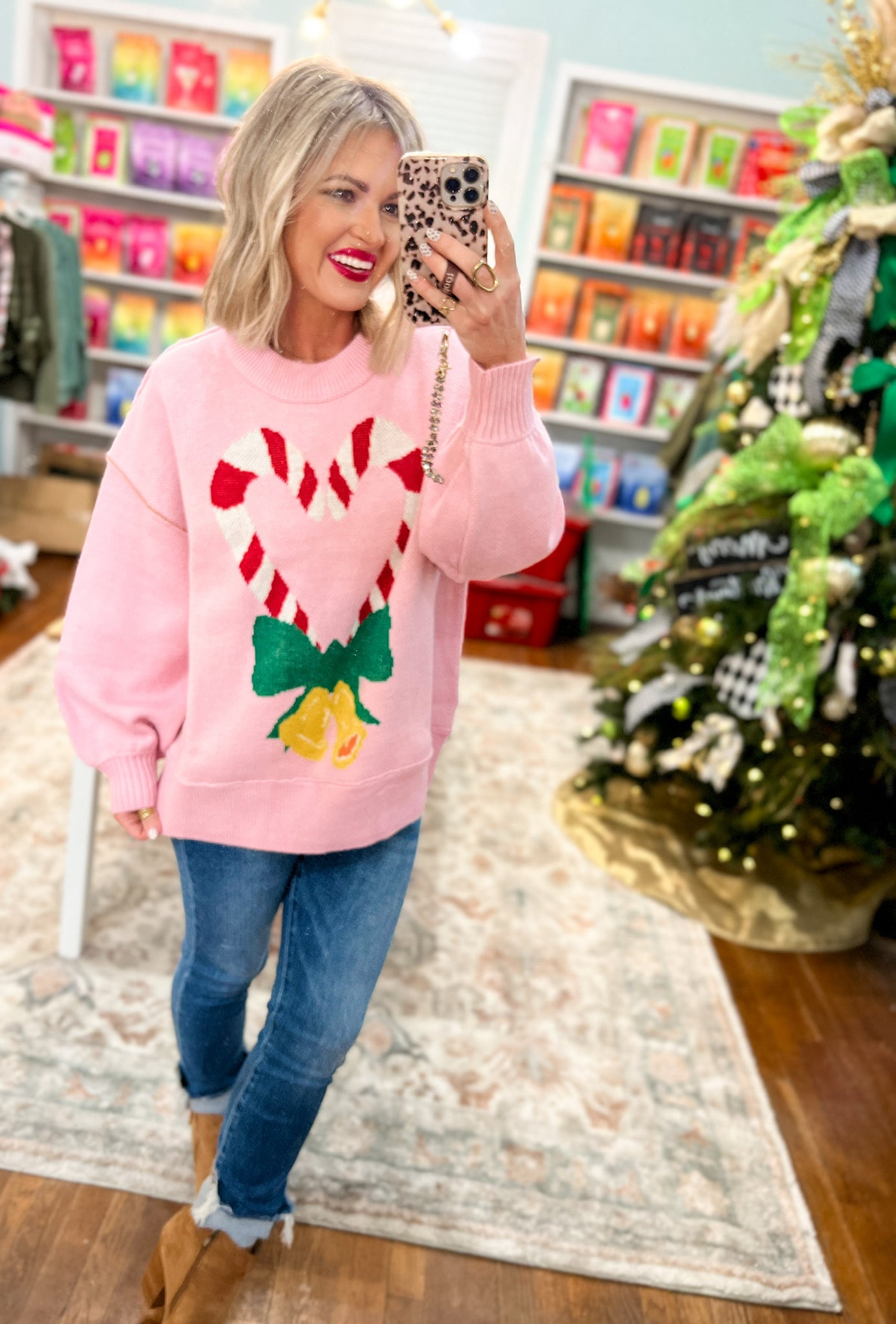 Wrap yourself in holiday cheer with this oversized candy cane sweater! Featuring a cozy round neckline and long sleeves, it's the perfect blend of festive fun and comfort. The playful heart candy cane design brings a sweet twist to classic seasonal style. Whether you're sipping cocoa or spreading holiday joy, this statement piece keeps you warm while turning heads.