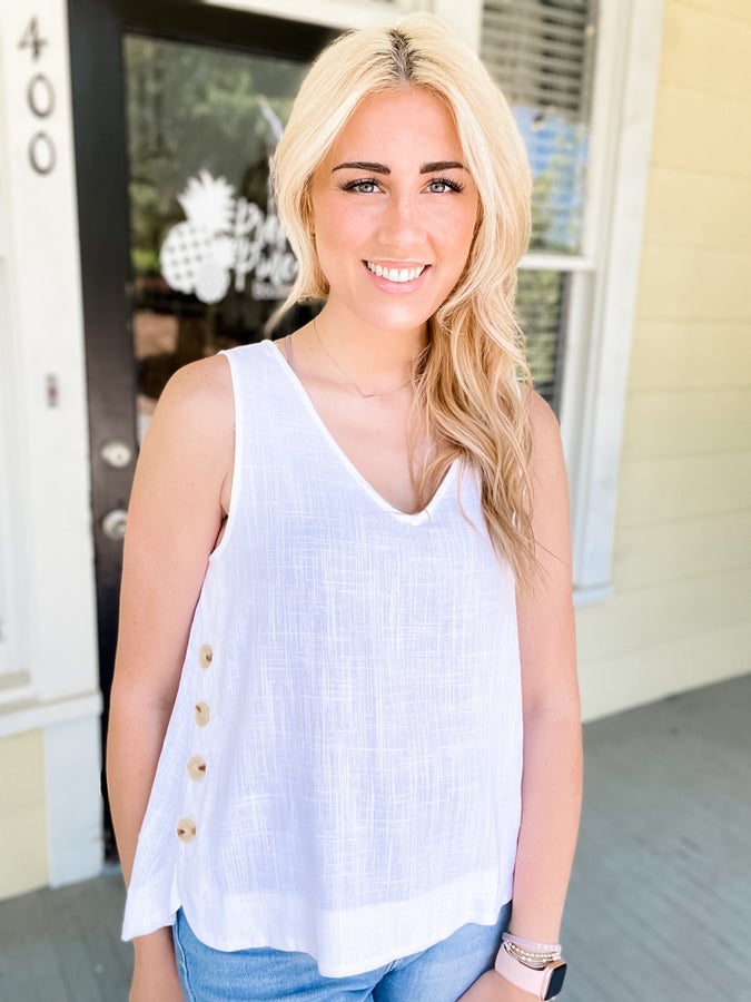 - A sleeveless solid woven top.