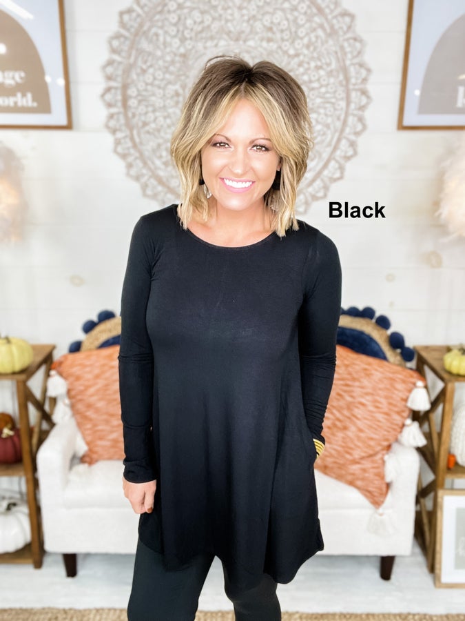 - Long sleeve, boat neck, flared top with side pockets.