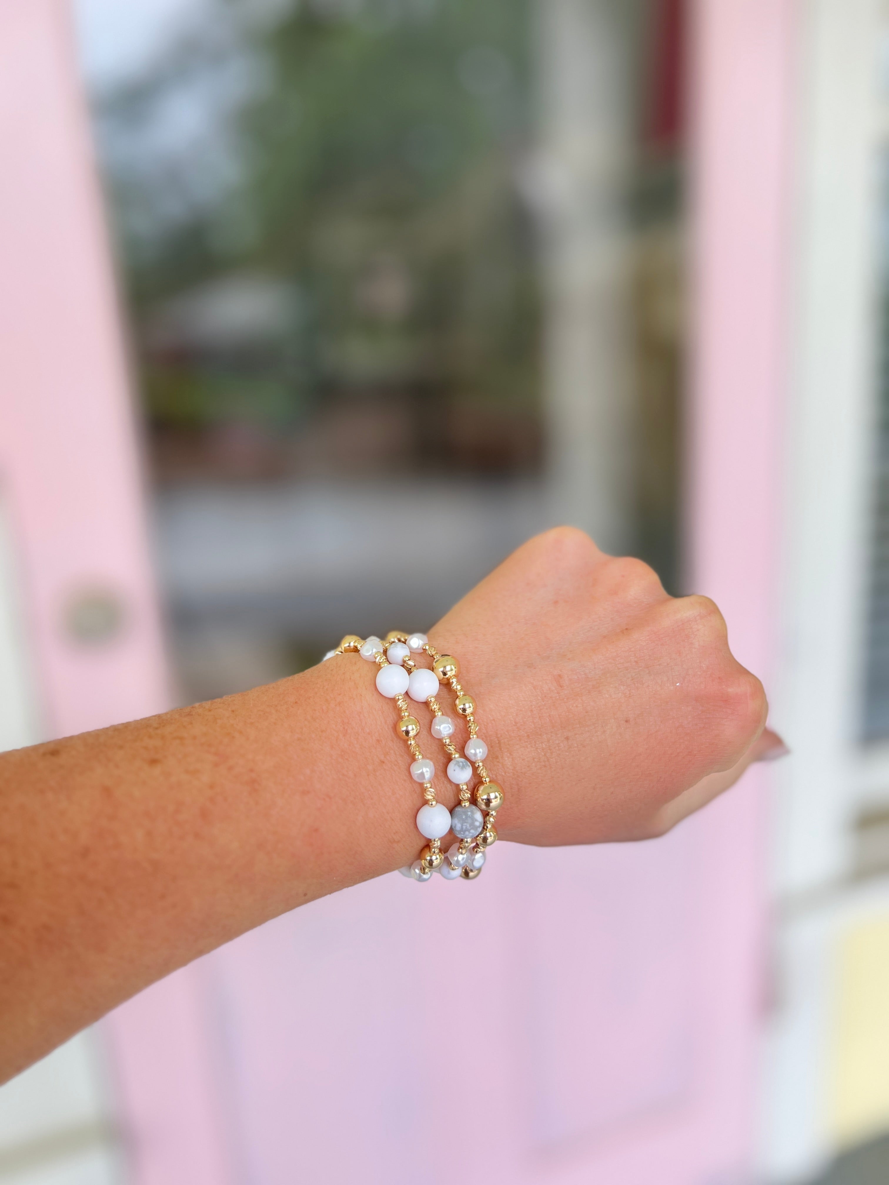 Set Of Three Beaded Stretch Bracelets Featuring Metal Tone , Stone, & Pearl Beads