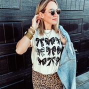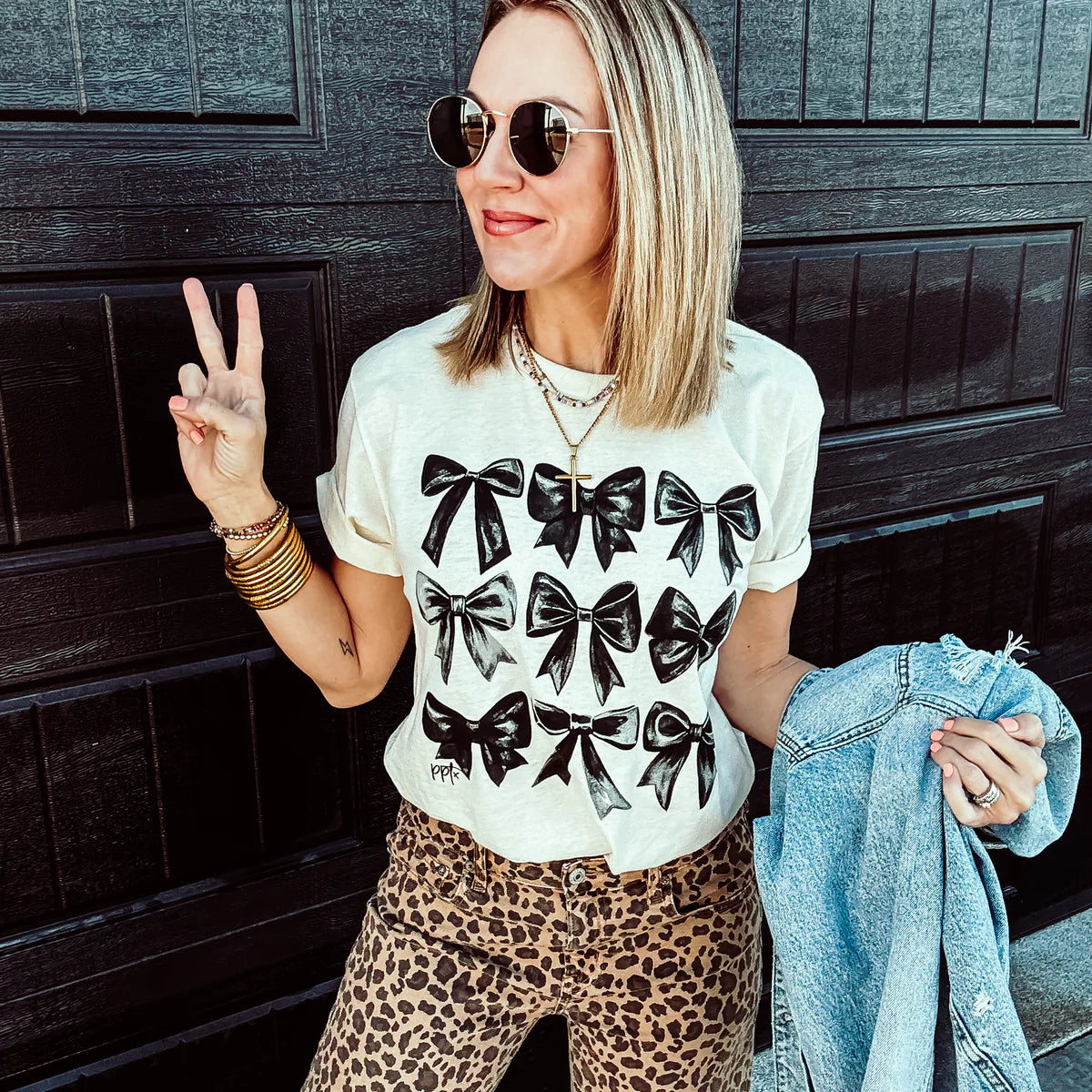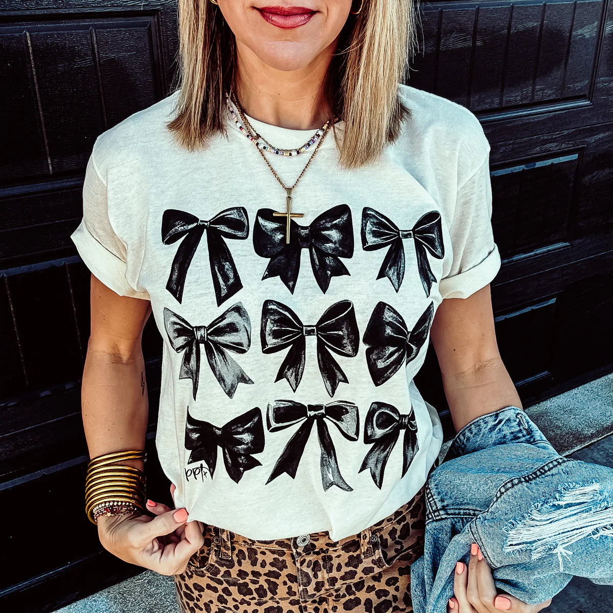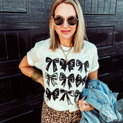 Get ready to turn heads with our Black Bows Tee! This graphic tee features a playful twist with black bows, giving it a classy and cute touch. Perfect for adding some fun to your outfit.