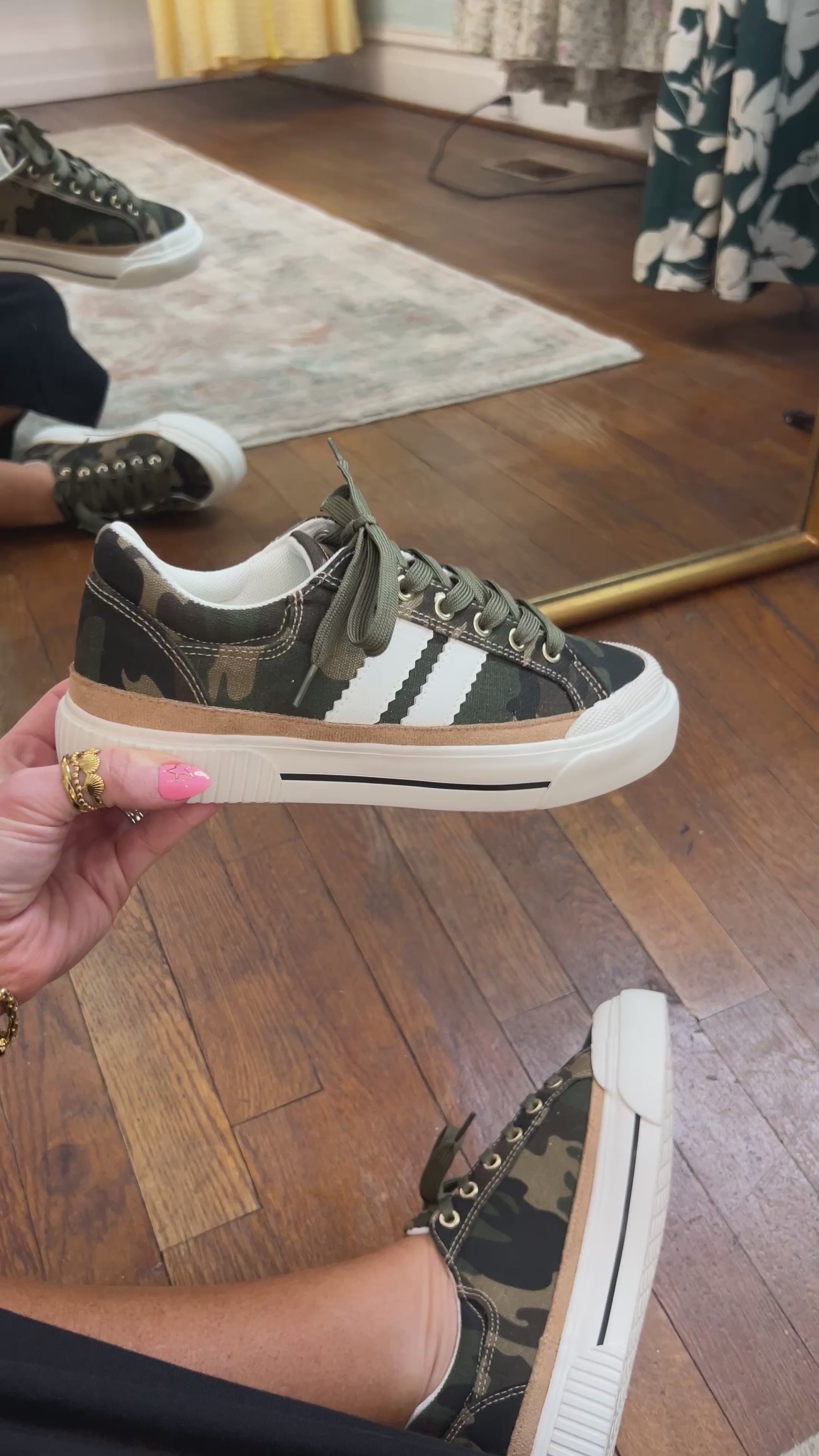 Add a little edge to your everyday look with these must-have camo sneakers. Featuring a bold camouflage print with eye-catching red laces and coordinating side stripes, this pair brings the perfect pop of color to your casual lineup.