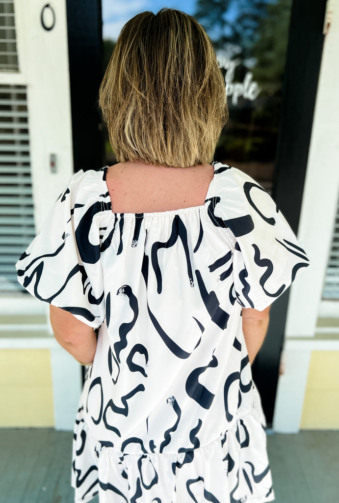 Print square neck bubble sleeve tiered mini dress featuring smocking along neckline. Pockets at side. Lined. Woven. Non-sheer. Lightweight.