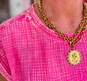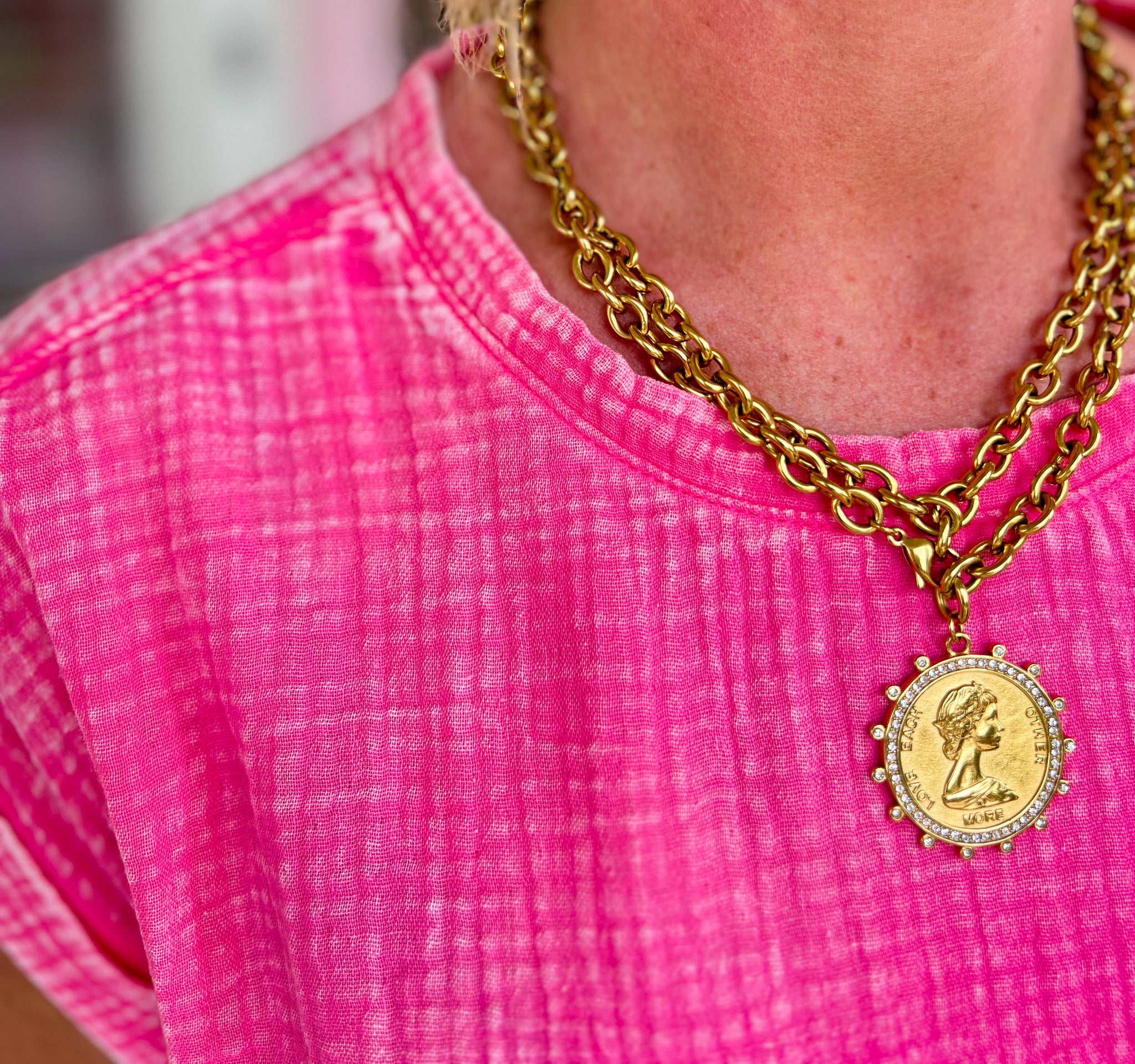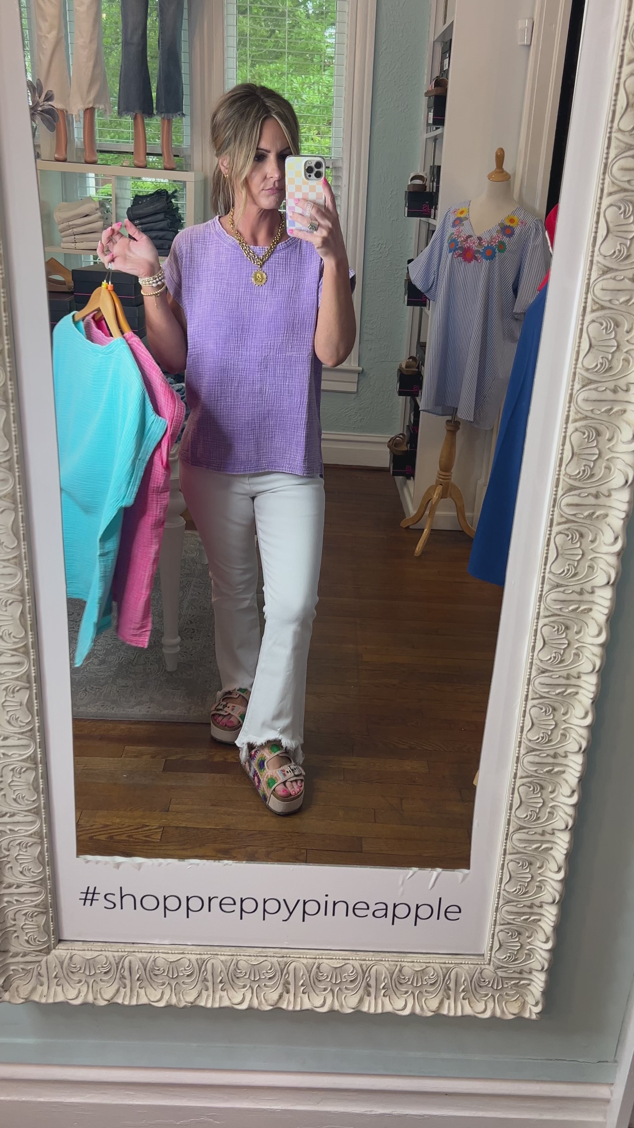 This woven double gauze top features a unique acid wash design and short sleeves. The hi-low hem and side slits add a stylish touch. Stay comfortable and on-trend with this versatile piece. ** Color may vary slightly due to monitor resolution.