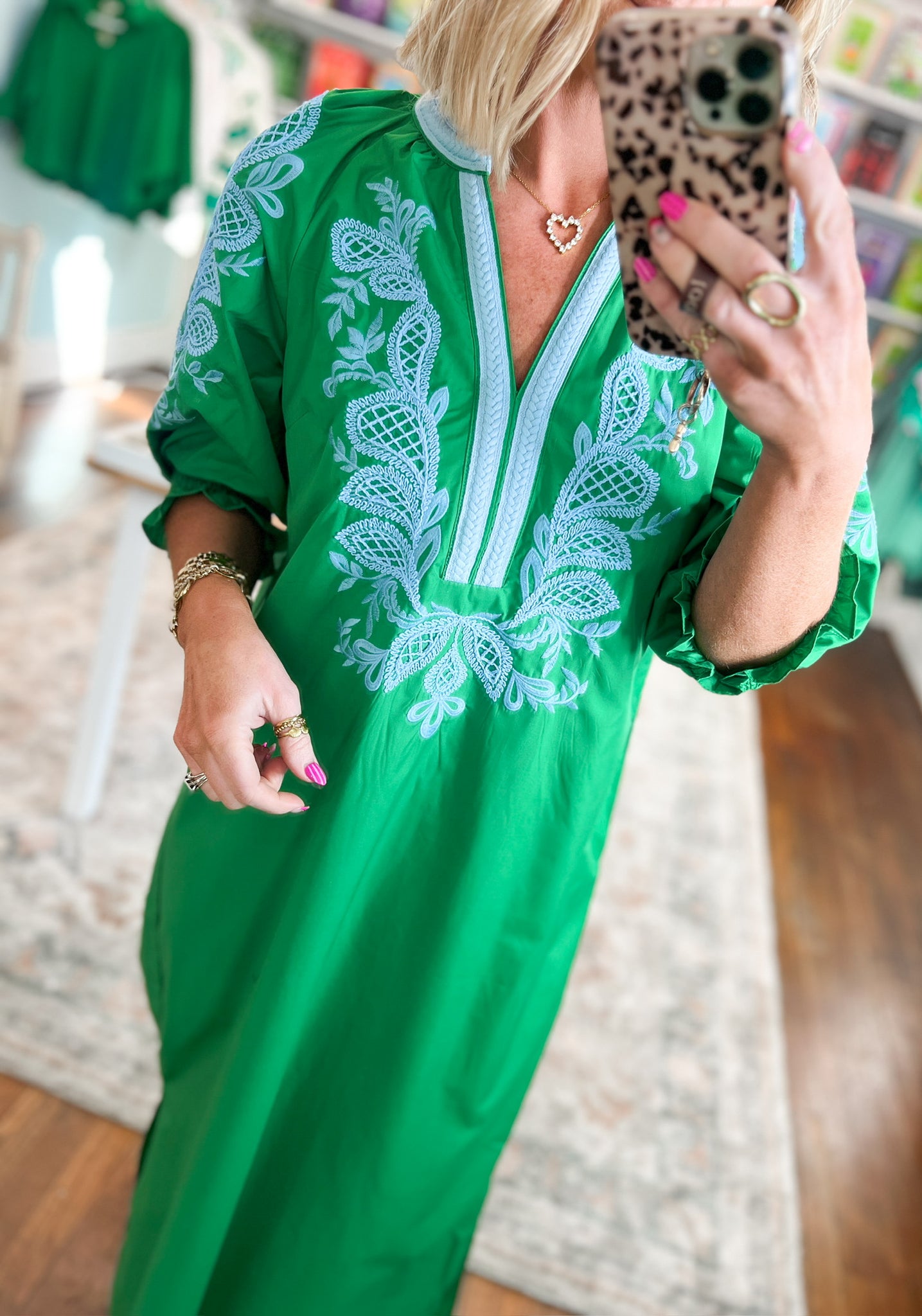 A meticulously crafted midi dress that balances structure with ease. The V-neckline is finished with contrast trim, complemented by half sleeves and delicate embroidered detailing that adds visual interest without excess. Constructed from a lightweight woven fabric that maintains its shape while remaining breathable, this dress delivers both durability and comfort. The fully lined interior ensures a smooth drape, while practical side pockets and strategic slits at the hem provide functional design. Non-sheer and versatile, it transitions effortlessly across seasons and occasions.