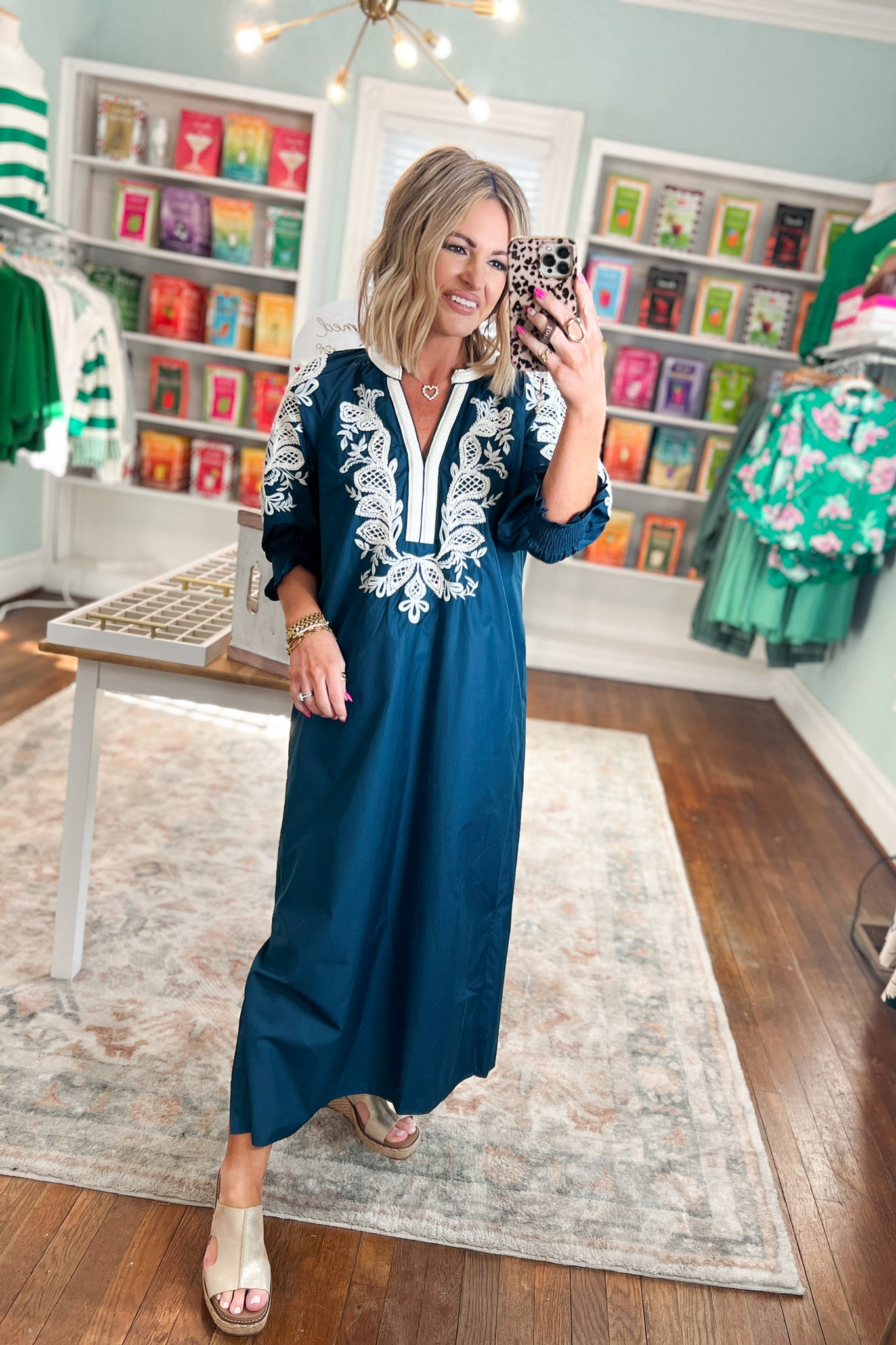 A meticulously crafted midi dress that balances structure with ease. The V-neckline is finished with contrast trim, complemented by half sleeves and delicate embroidered detailing that adds visual interest without excess. Constructed from a lightweight woven fabric that maintains its shape while remaining breathable, this dress delivers both durability and comfort. The fully lined interior ensures a smooth drape, while practical side pockets and strategic slits at the hem provide functional design. Non-sheer and versatile, it transitions effortlessly across seasons and occasions.