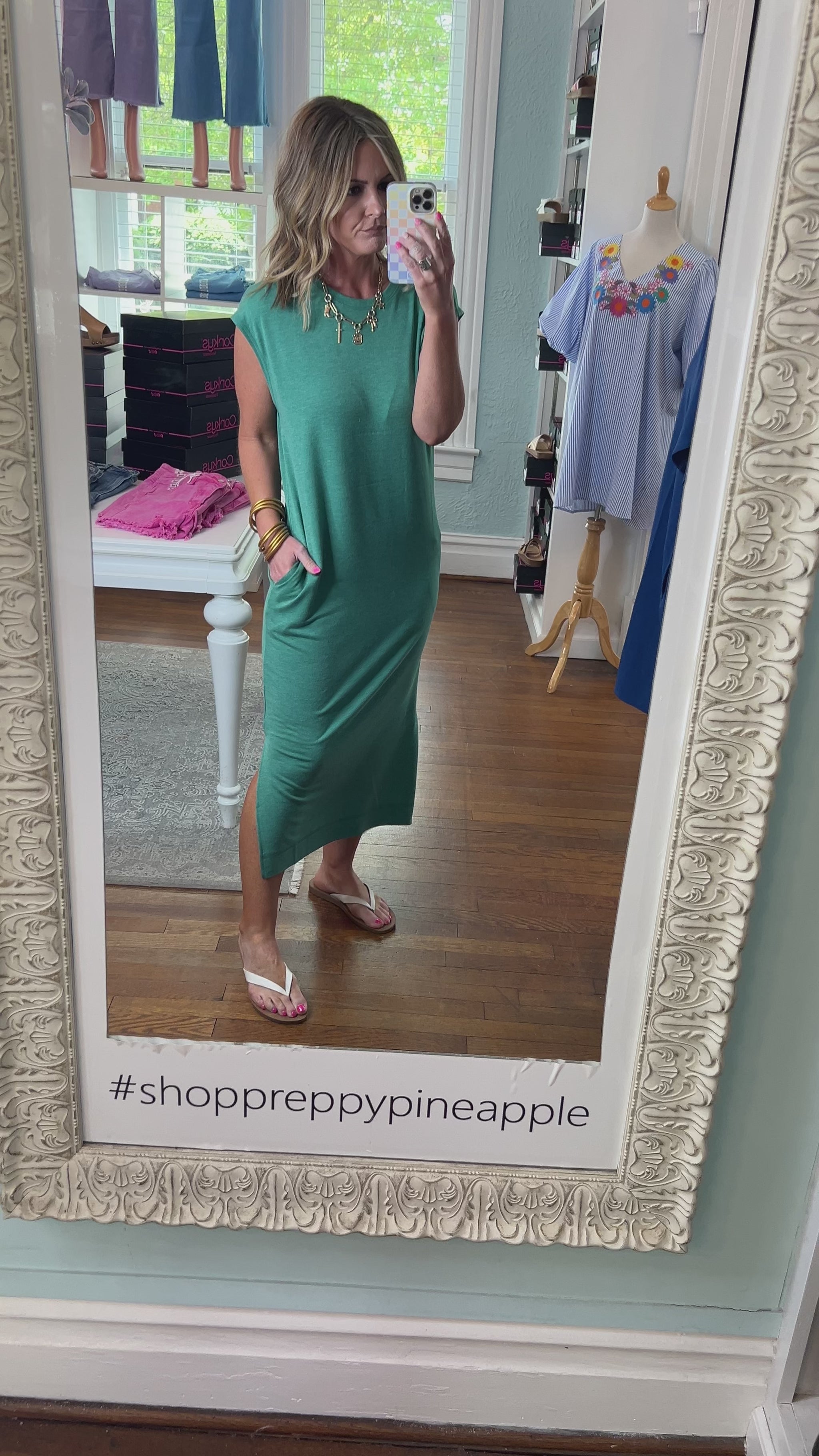 Add a touch of shine to your wardrobe with our Make It Shine Midi Dress! This French Terry dress features a sleeveless design, round neck, and midi length for effortless style. Plus, with convenient side slits and pockets, you can rock this dress wherever you go. Shine on, fashionista!