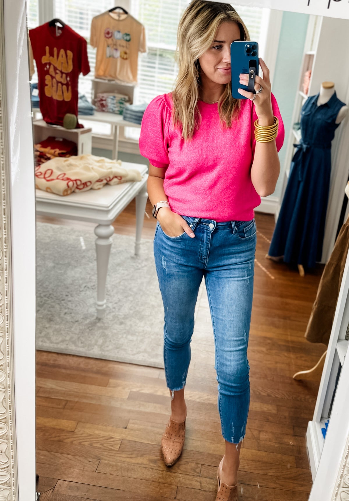 This is the pair of skinnies you've been looking for! Pearl Jammin' Skinny jeans are a mid-rise, raw hem, skinny that is well-structured but stretchy fit that makes you look (and feel) good! The ankle length is petite-friendly and the fun hem showcases a pair of shoes so well. They are non-distressed but still have a trendy, laid-back vibe.