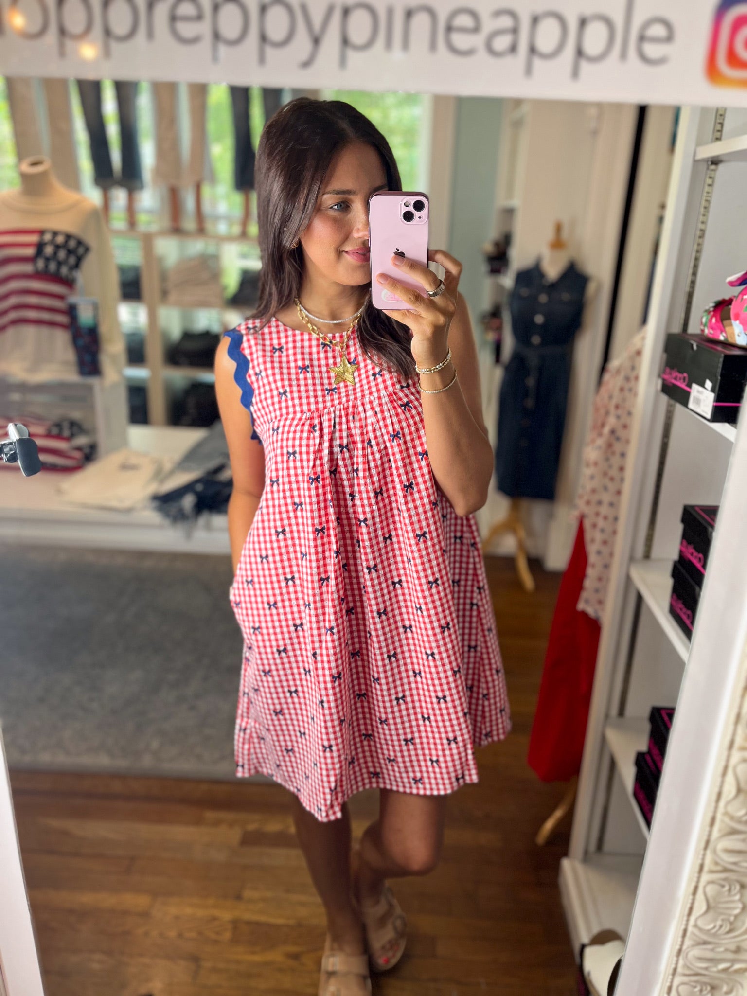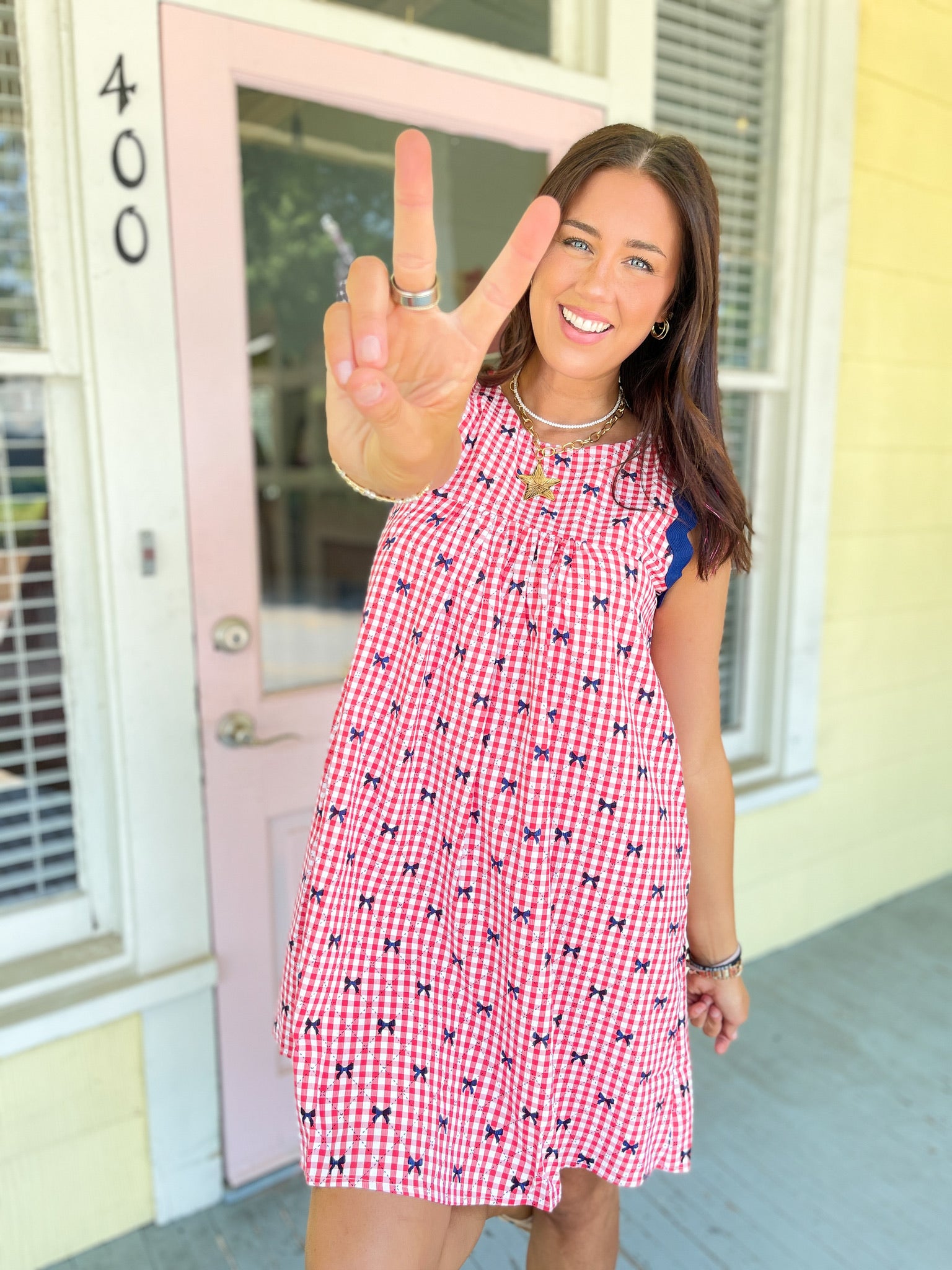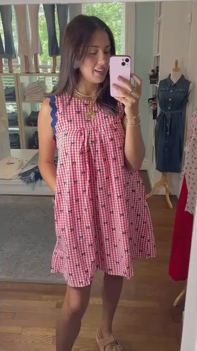 Embrace a playful, stylish look with the Picnic State of Mind Mini Dress. Crafted from check woven fabric, this sleeveless mini dress features a charming bow print and is accented with contrasting ric-rac trim for a unique touch. Perfect for warm days, its lightweight design keeps you comfortable while the mini length adds a flirty vibe.
