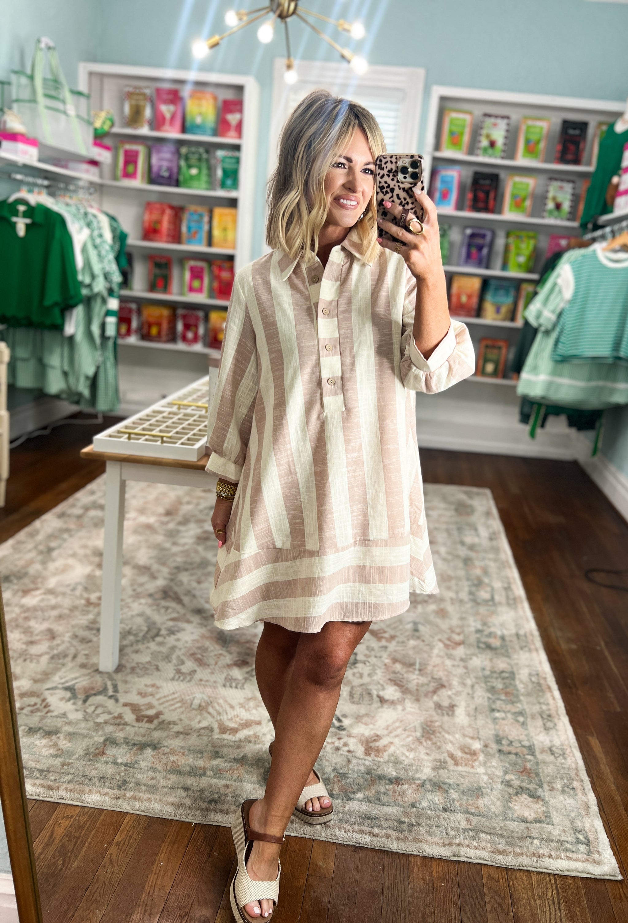 Slice of Happiness Striped Shirt Dress - Oatmeal/Taupe