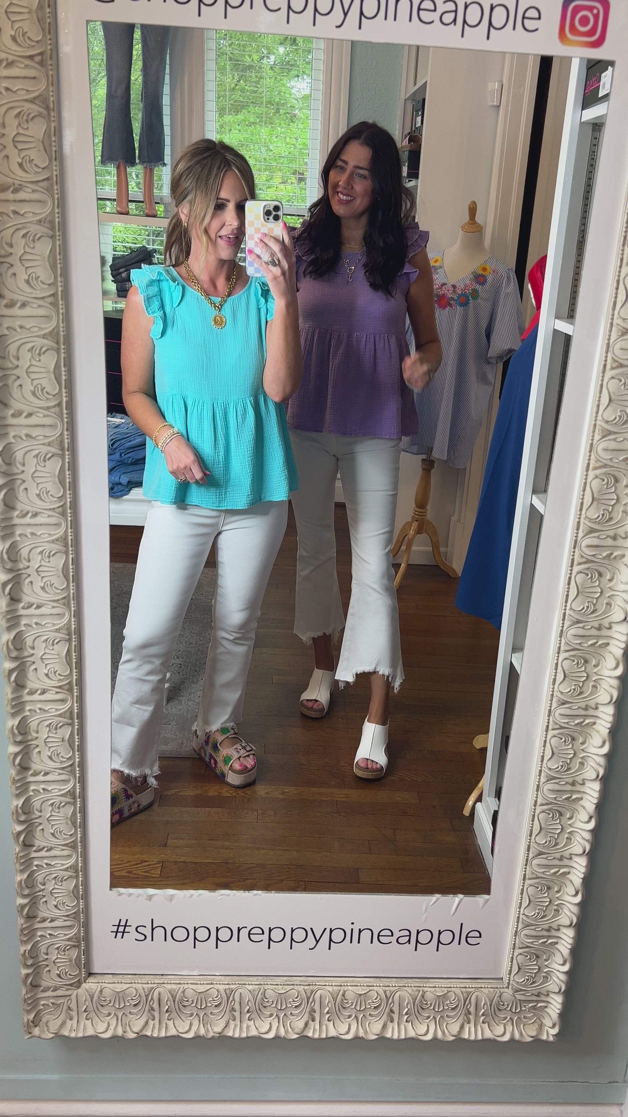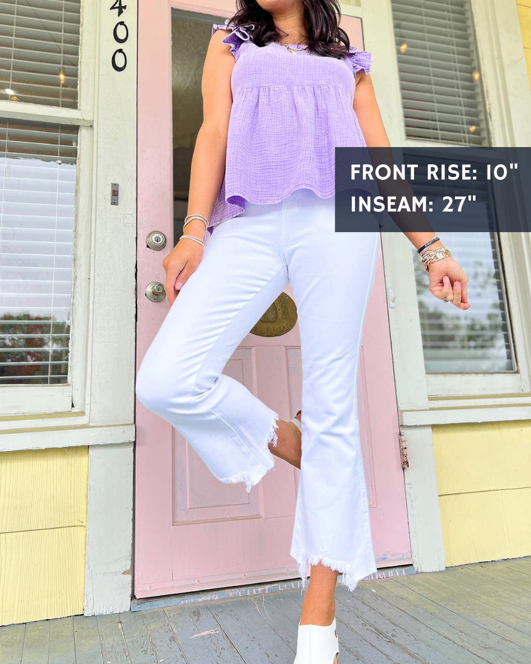 Get ready to rock some serious vintage vibes in our Snow White High Rise Crop Flare. The uneven hem adds a touch of playfulness to this classic silhouette, making it the perfect addition to your wardrobe.