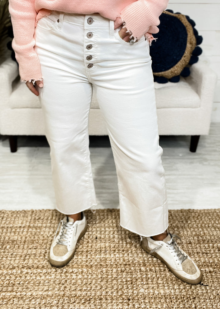 Button fly, raw hem, cropped wide leg, denim pants.