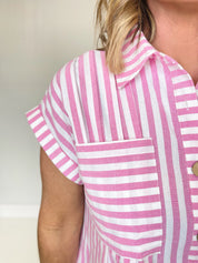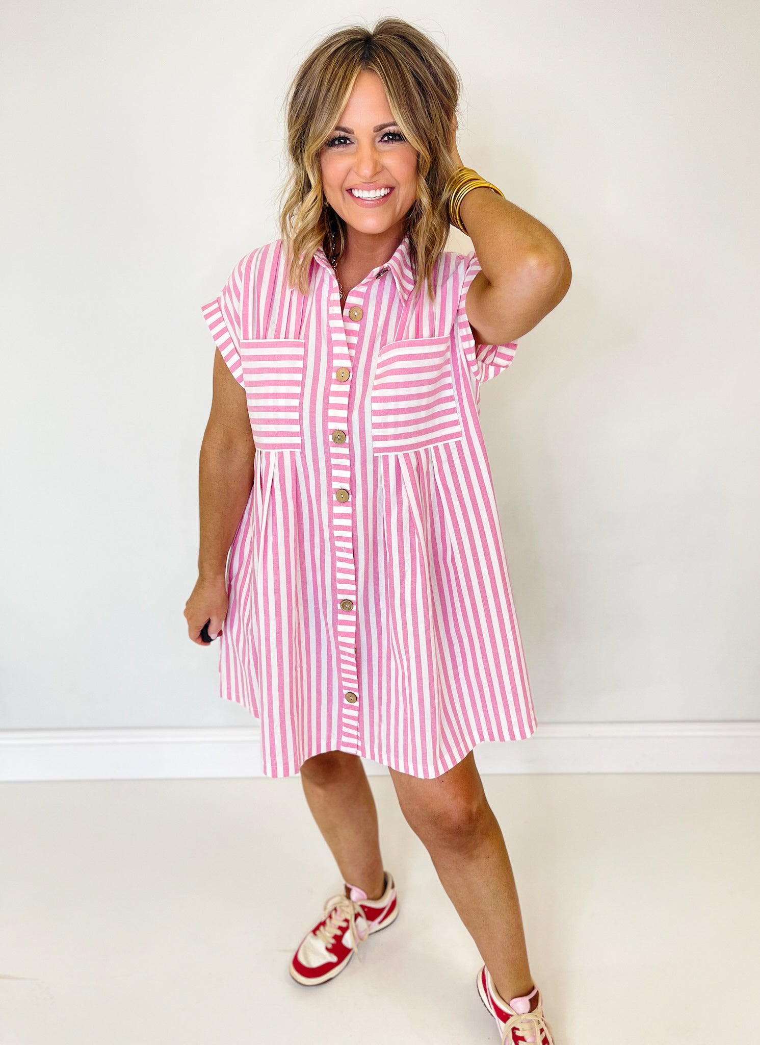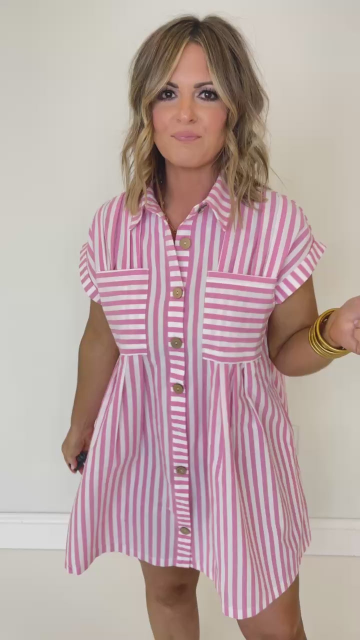 Stay effortlessly chic in this Cotton Striped Button Down Tunic Dress. Crafted from a breathable cotton fabric, this dress offers a lightweight and comfortable feel, perfect for warm days. The timeless striped pattern and button-down front add a touch of sophistication, while the relaxed tunic silhouette ensures easy, versatile styling. Wear it as a dress with sandals or layer it over jeans or leggings for a laid-back yet polished look.